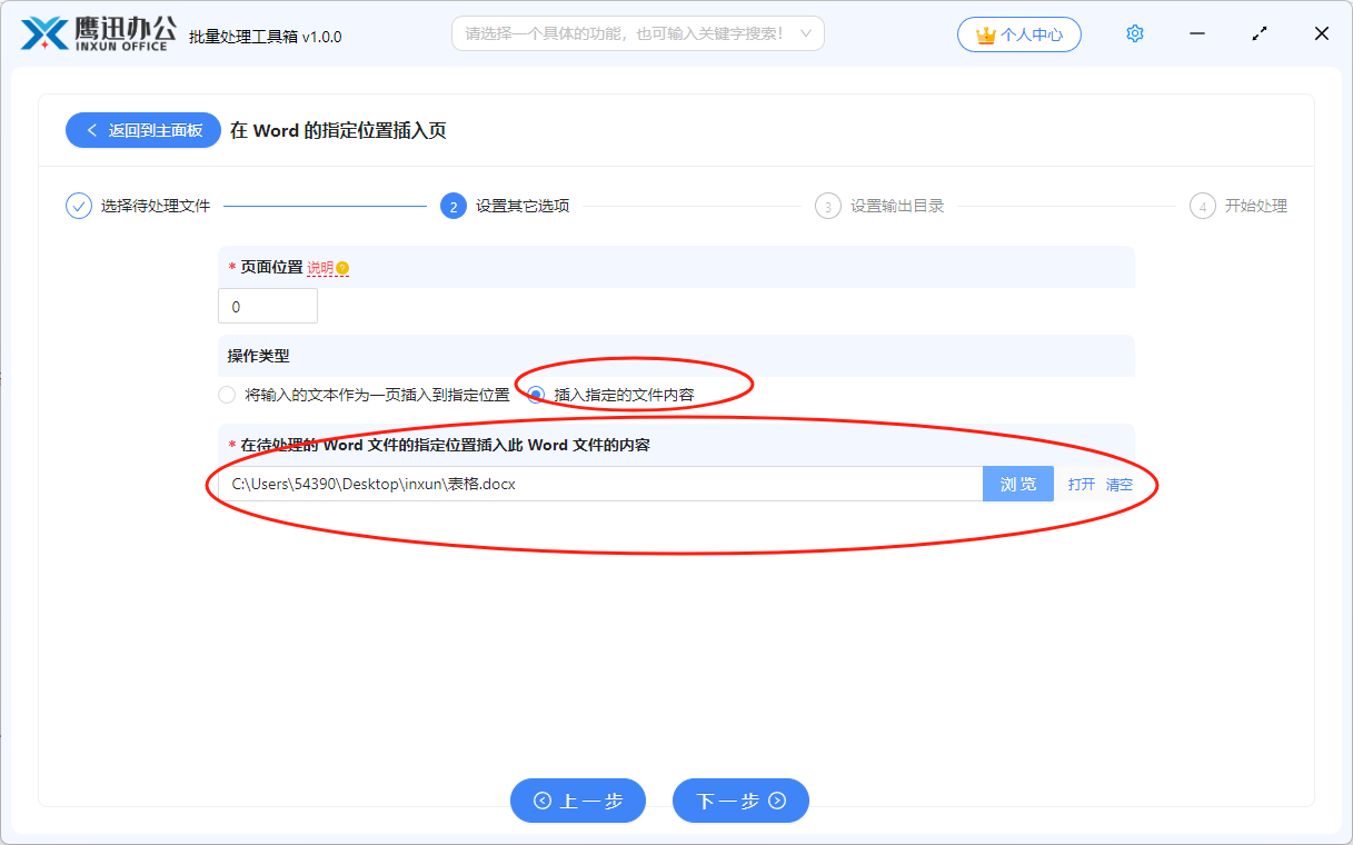 - 【操作类型】这个选项非常的简单,我们可以将一段文本插入到多个word文档的指定位置。也可以将某个word文档的内容,插入到多个word文档的指定位置。
